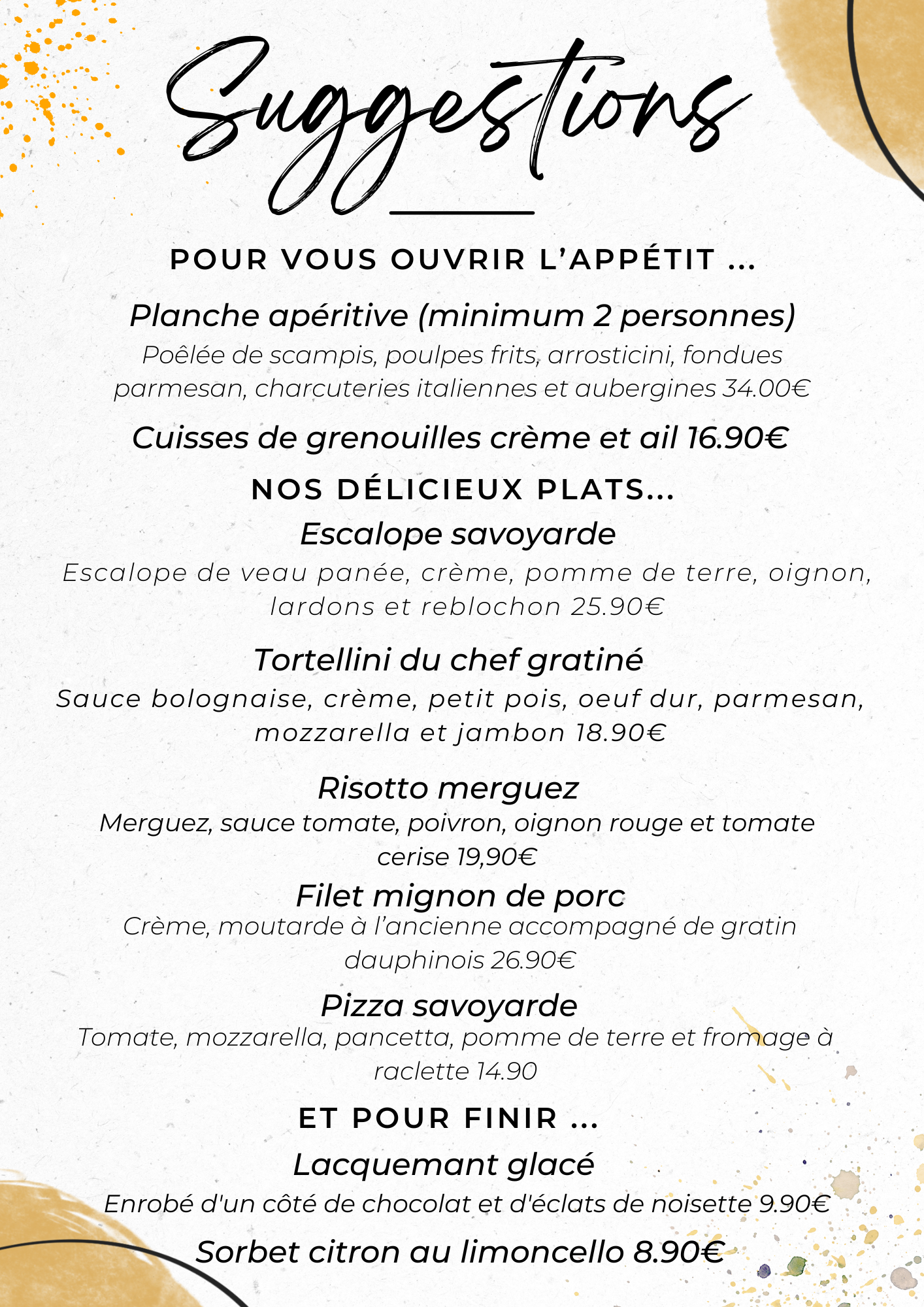 N’attendez plus, venez gouter à nos délicieuses pizzas cuites au feu de bois , nos pâtes fraîches, nos risottos d’exception, nos viandes exquises, nos tendres poissons et nos desserts faits maisons.