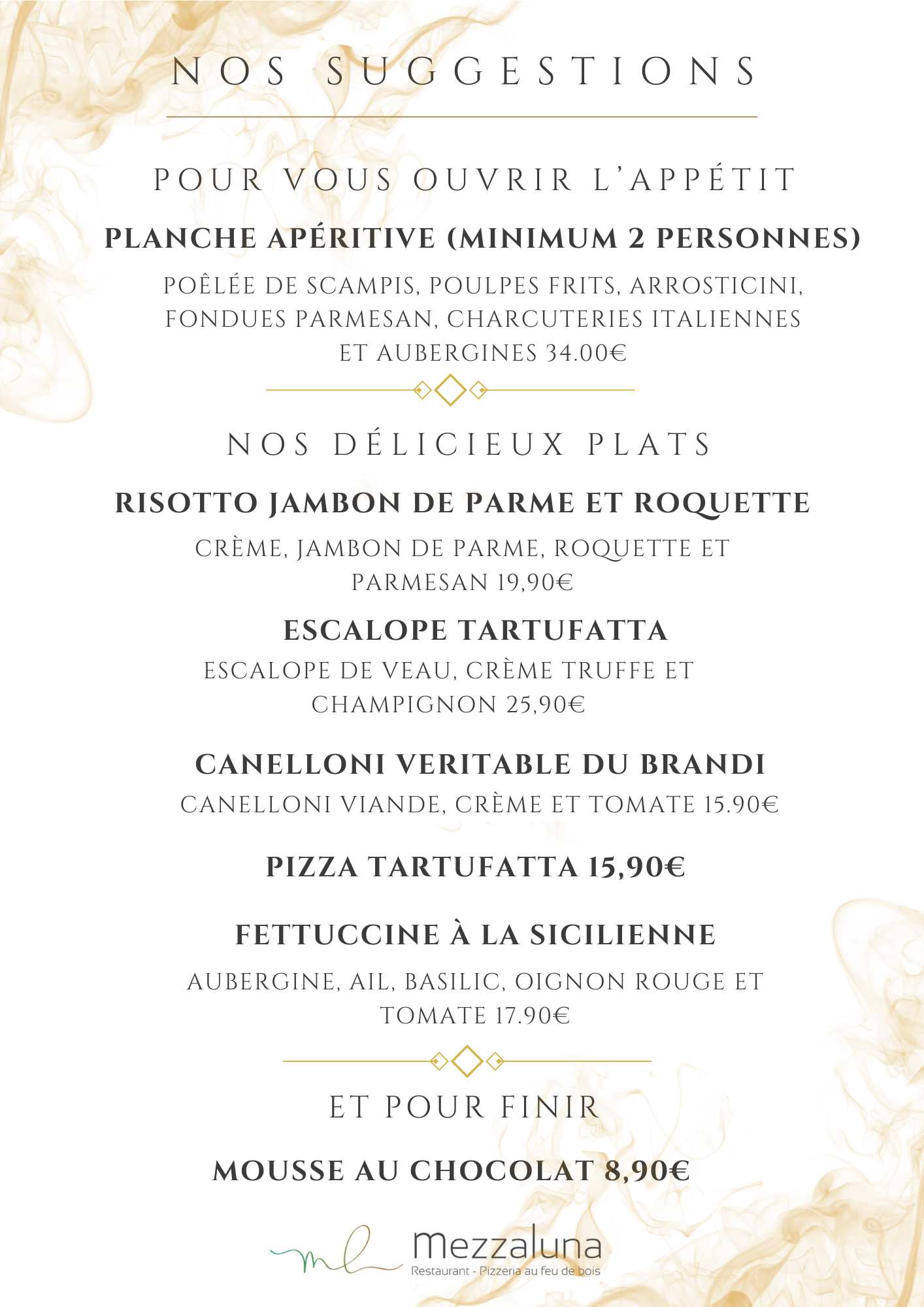 Au restaurant « Mezzaluna », nous vous proposons toujours de succulents repas composés de produits frais .